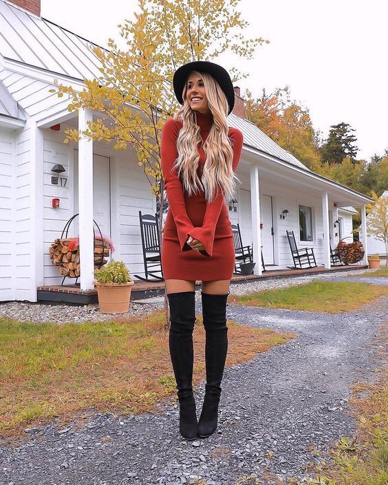 Fall dress for a slightly warm day 🤩 Hope everyone is having a good week so far! Today is perfect fall dress weather. Just a slight breeze but still warm! 😇 Sweater Dress Thigh High Boots Black Hat