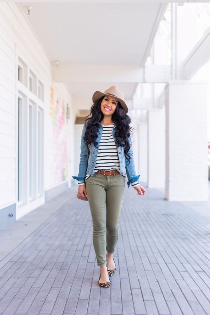 We made it to Friday again! 🥰🥰 Casual Friday is here and these olive green pants are a head turner for sure 🤩 Olive Green Pants Striped Tee Denim Jacket Brown Belt Cheetah Print Flats